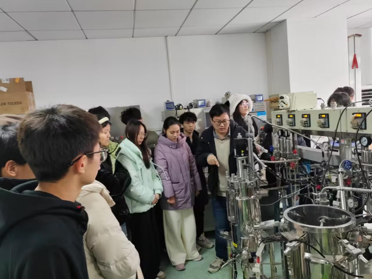 在武汉远大弘元股份有限公司,公司负责人带领学生参观了氨基酸发酵从研发实验室到车间生产的各个环节。带队教师饶德明针对发酵过程中可能遇到的问题进行了深入浅出的讲解,使学生们对利用微生物生产高附加值产品有了更加深刻的认知。