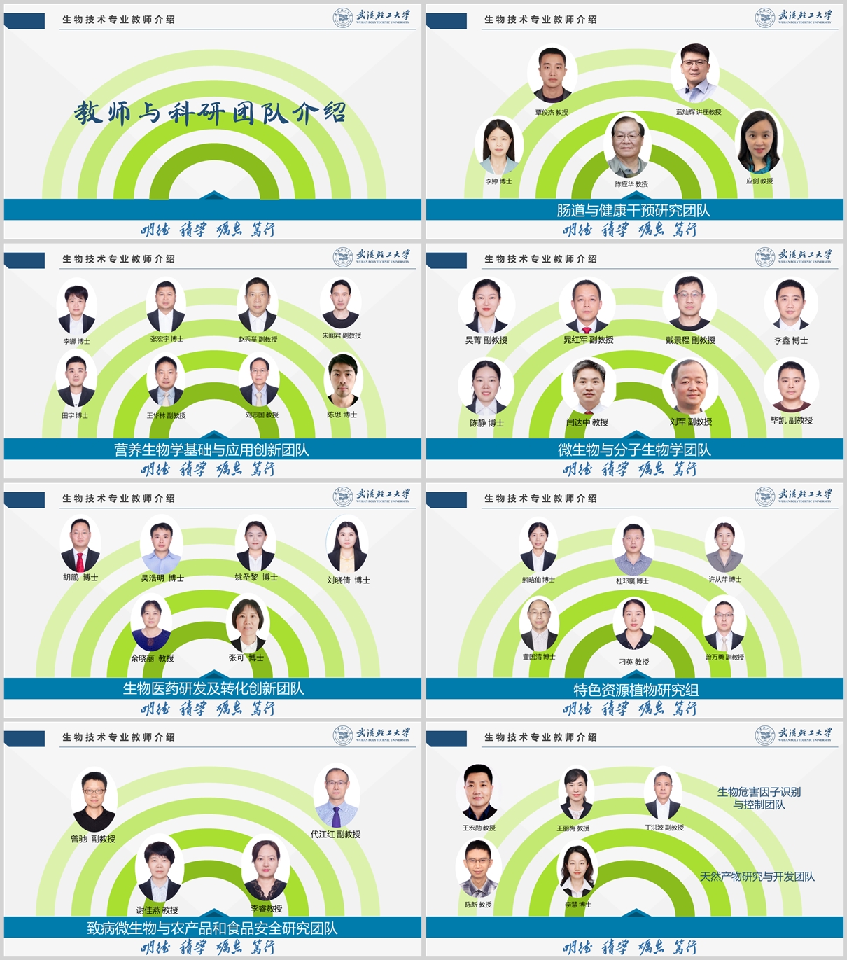 生物技术专业目前有专业教师30余人,其中楚天学子3人,教授8人,副教授8人,博士生导师2人,硕士生导师16人。在岗专任教师中博士学历教师比例达100%,其中56%的专业任课教师具有国外有访学或工作经历,60%教师有在生物技术企业实践经历。专业教师根据研究方向的不同,分属于8个科研团队。